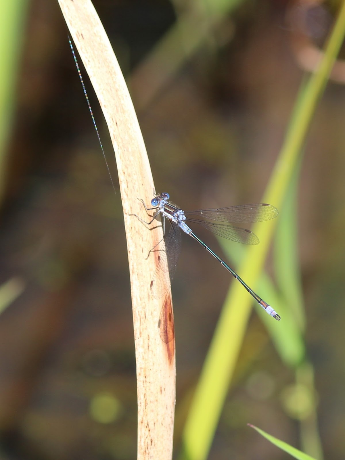 The picture below is a spreadwing (it alights with the wings spread out) and I believe it is most likely the lyre-tipped spreadwing (Lestes unguiculatus), but it might be the sweetflag spreadwing (Lestes forcipatus). I believe it's the former because the area behind its head is pale in colour, but I am only guessing based on photographs and field guides.